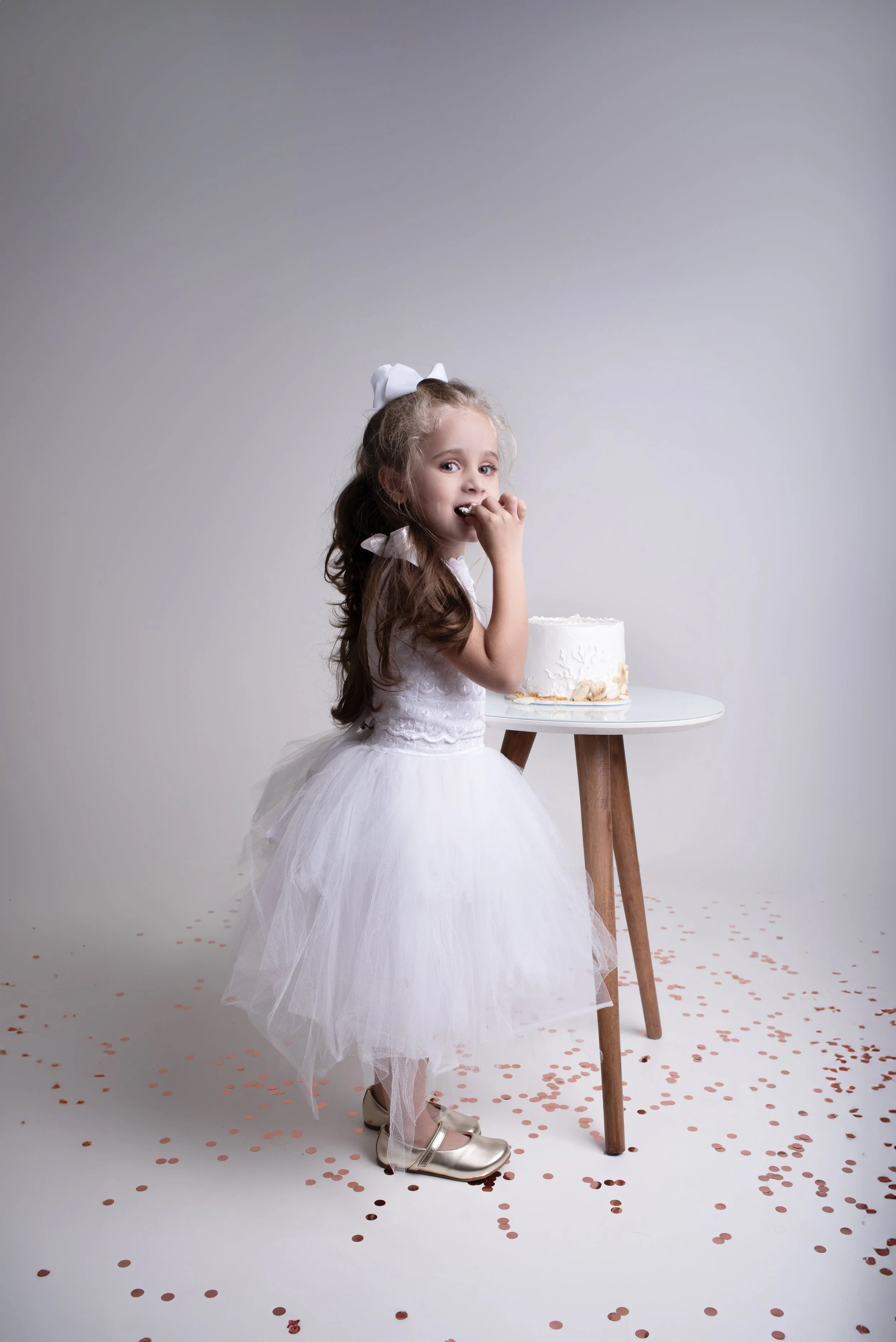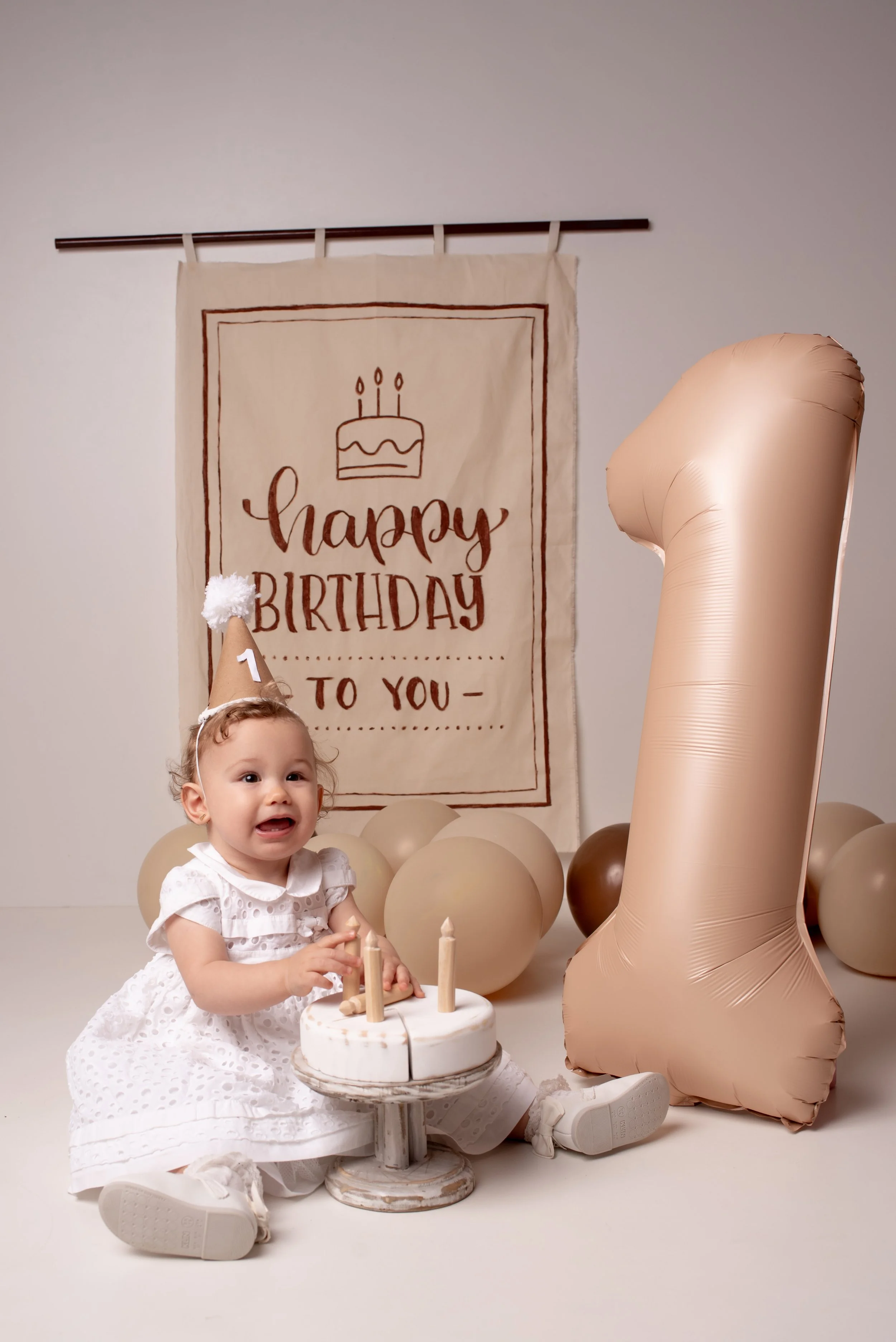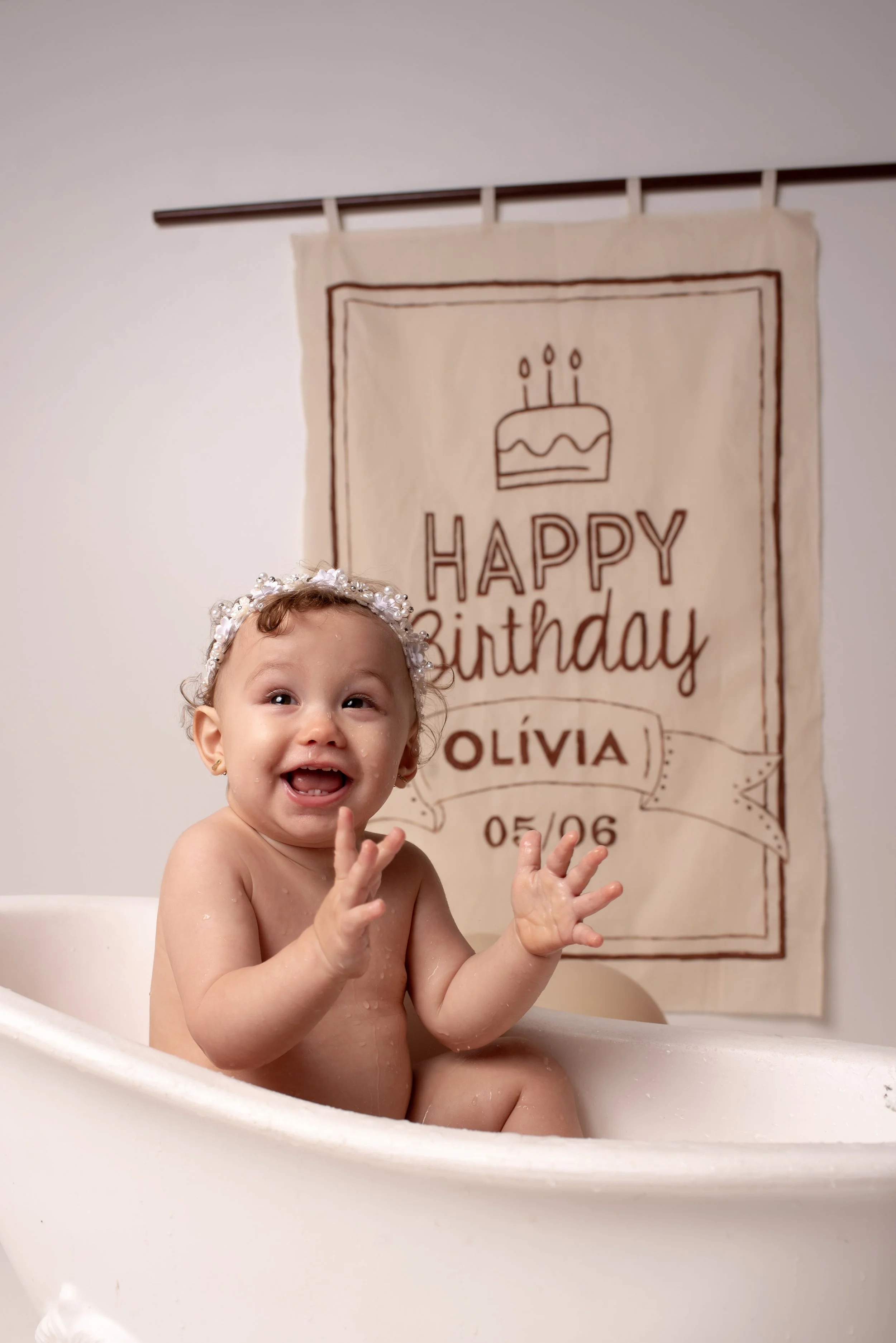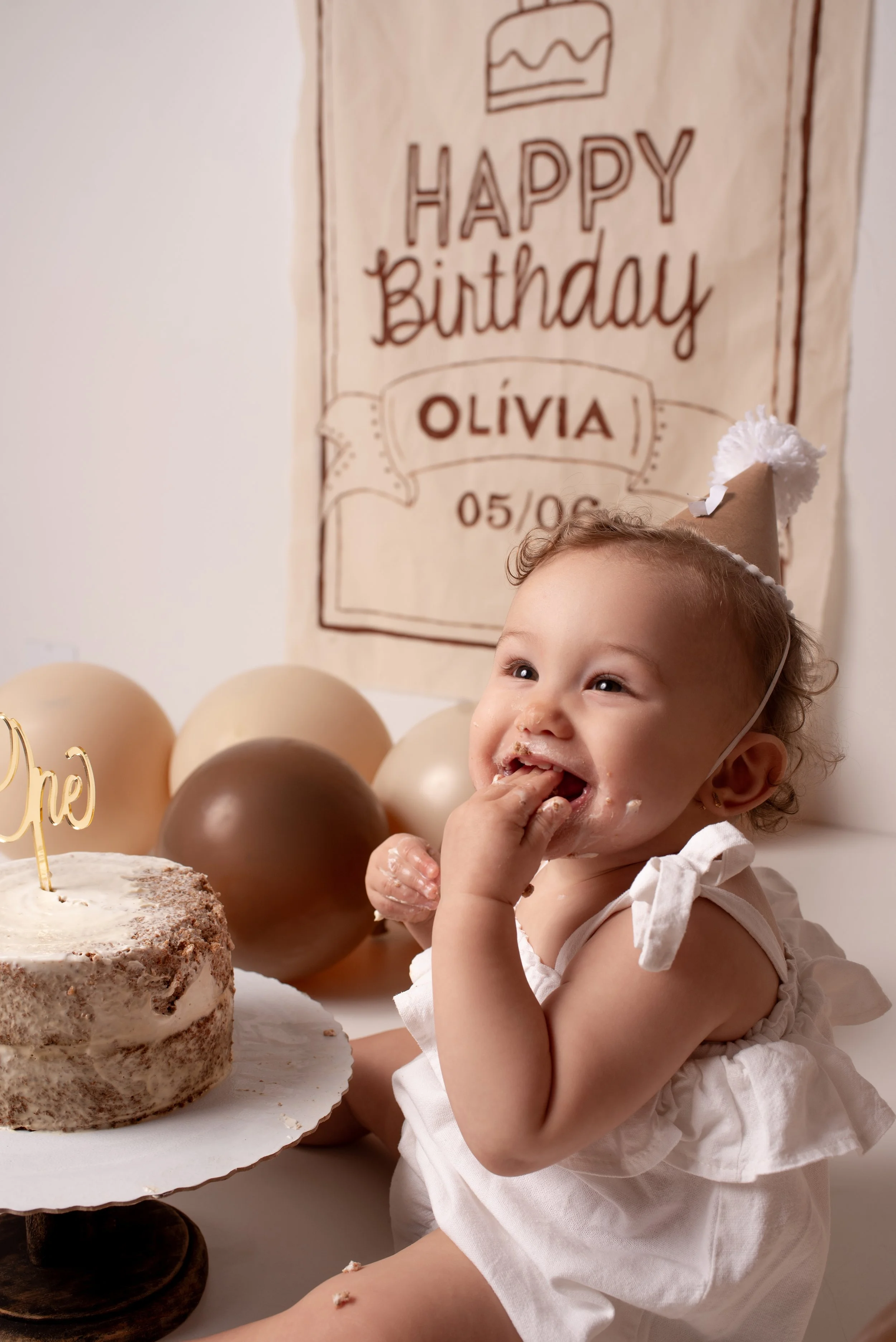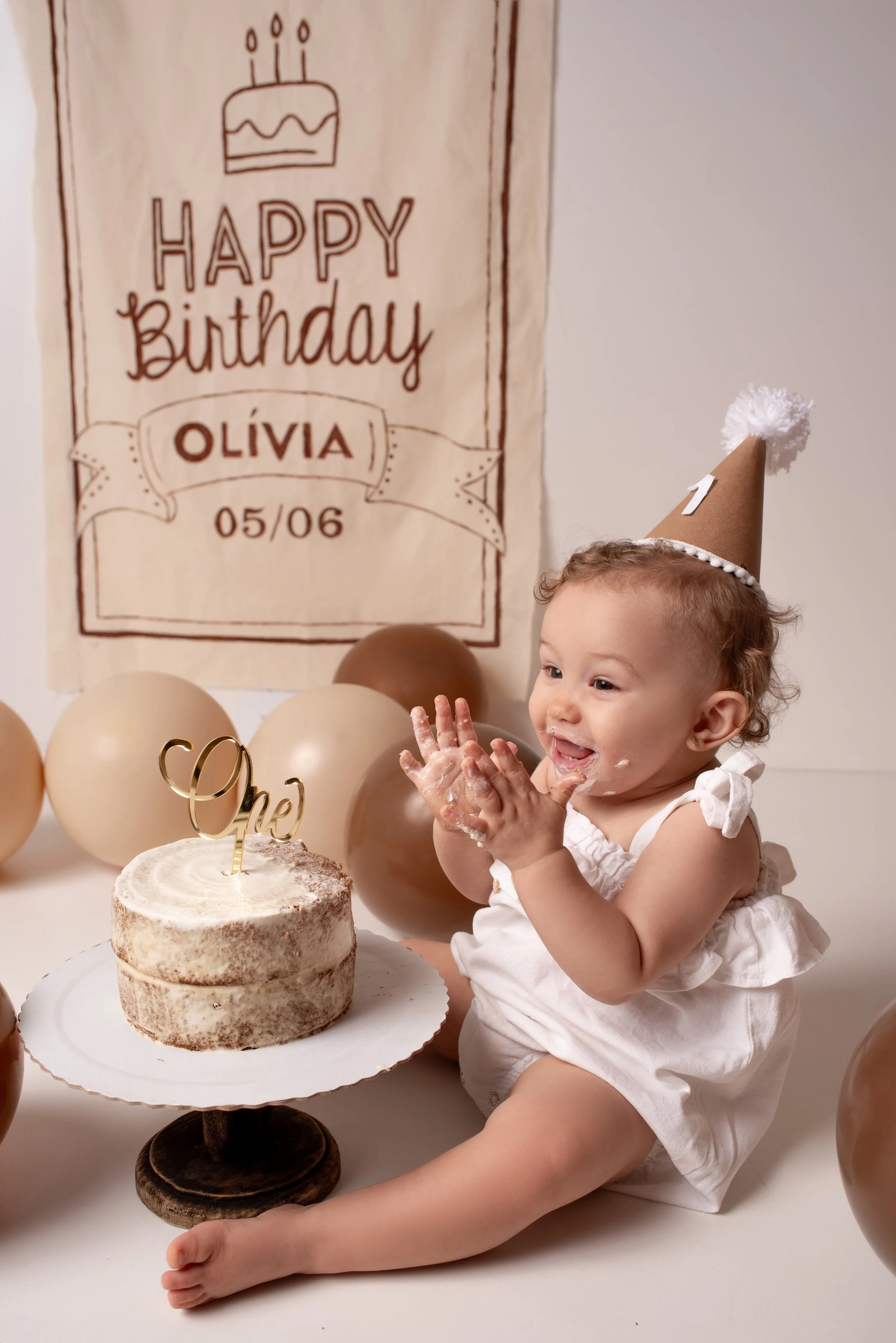 O Cake Smash Soft é um ensaio pensado para quem busca uma abordagem simples e delicada. Sem temas específicos, ele traz um painel de tecido pintado à mão, que pode ser personalizado com o nome da criança, tornando-se uma linda lembrança para a família.